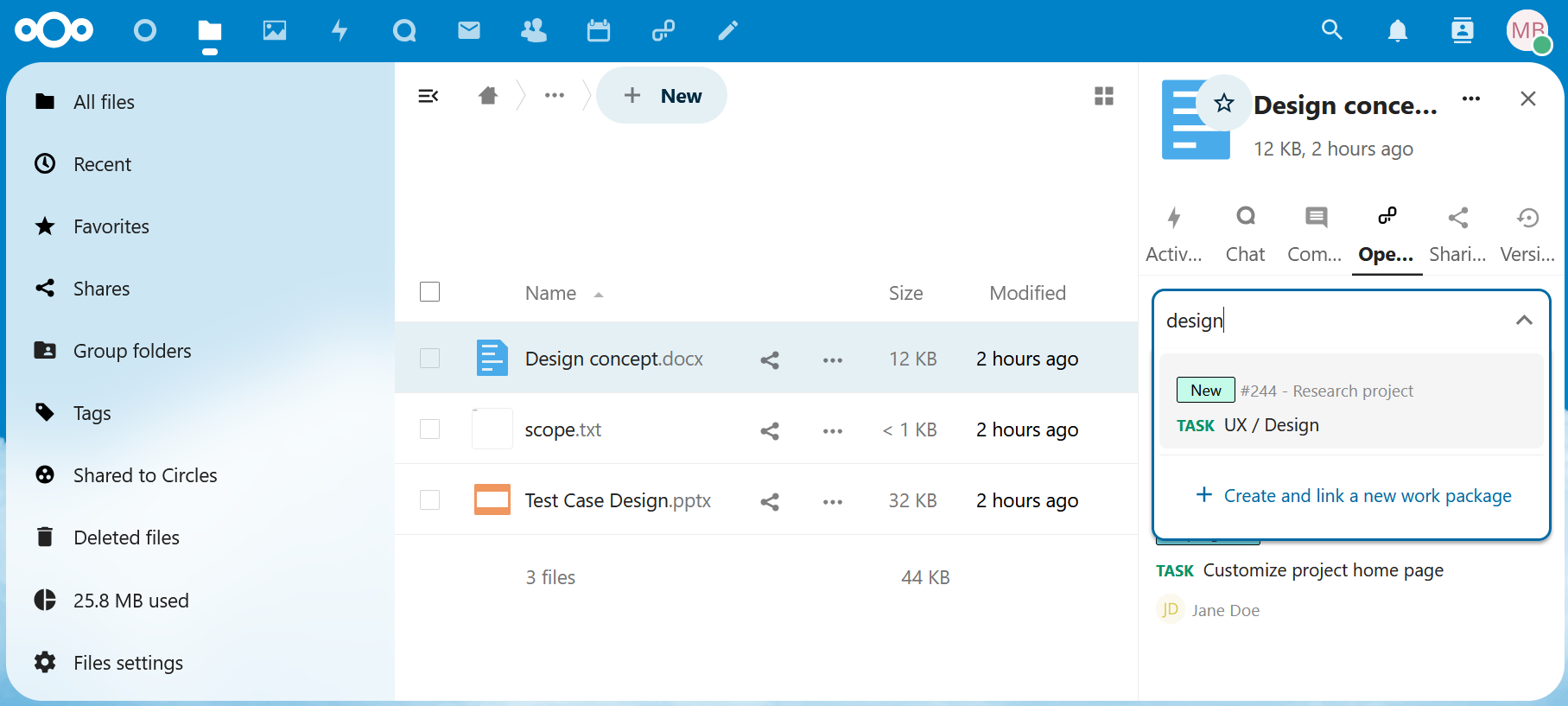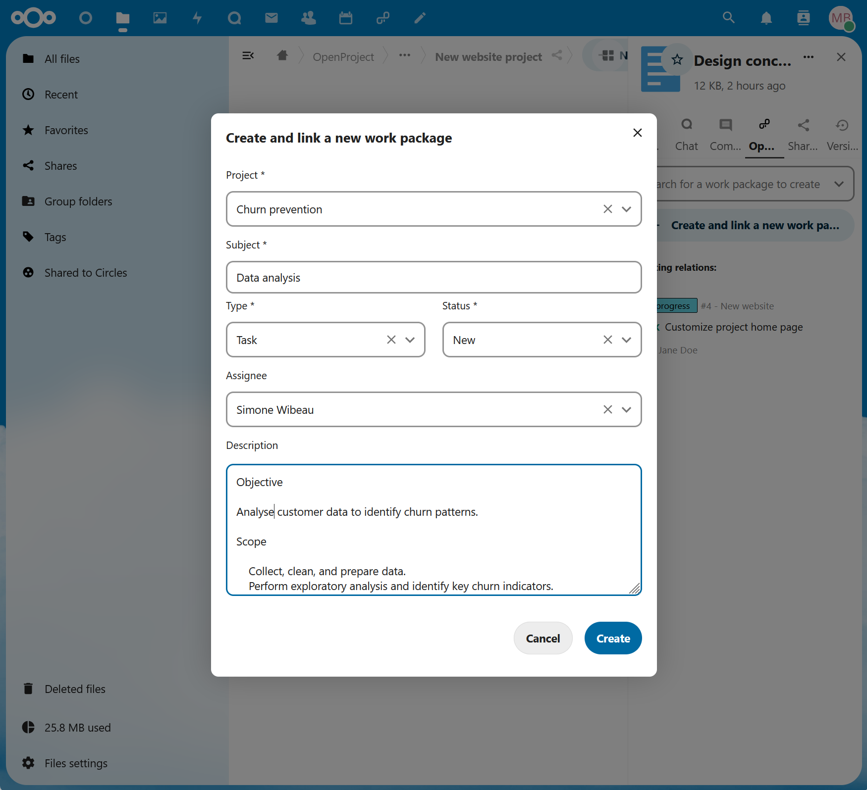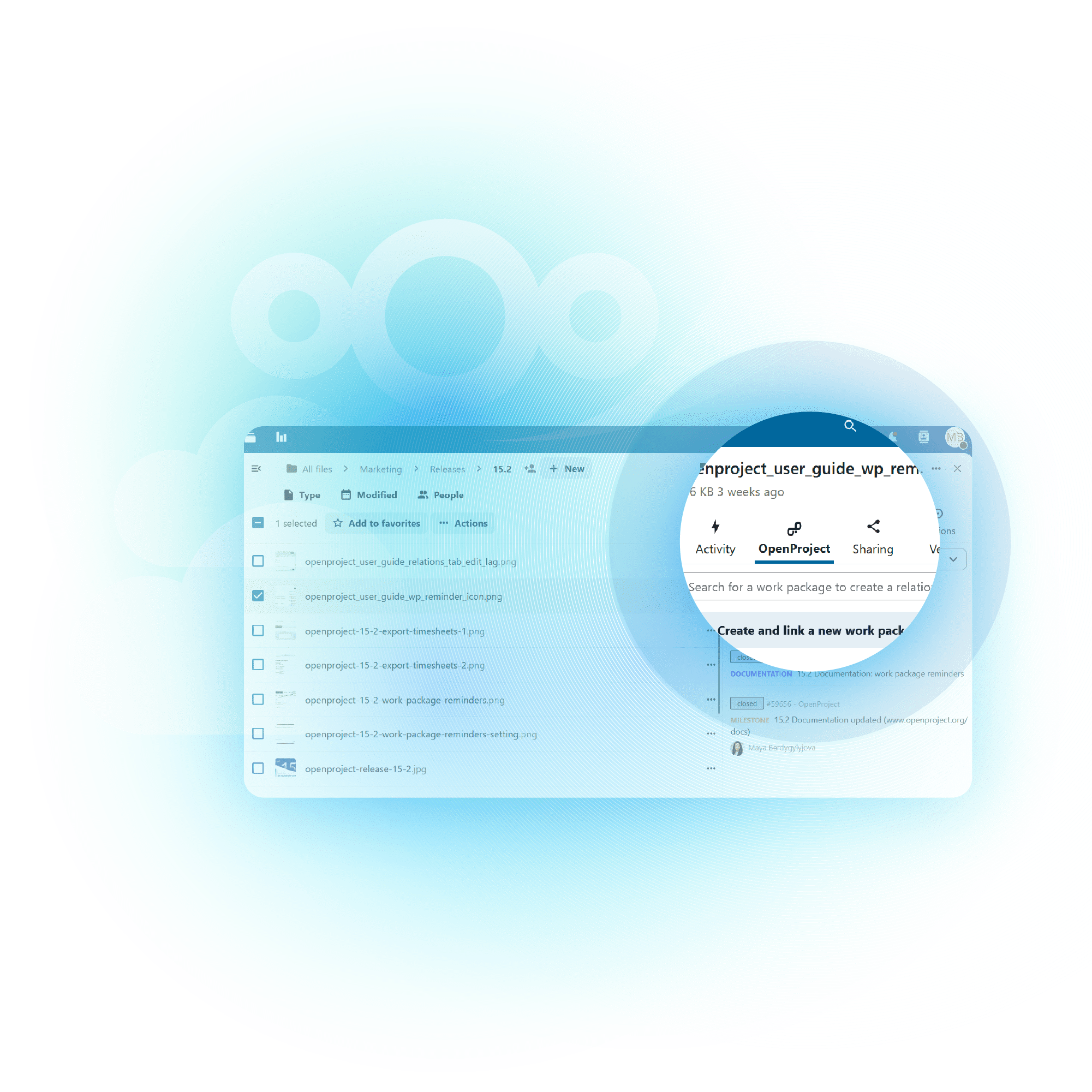 Create and link work packages directly in Nextcloud. Whether you’re browsing through project files or brainstorming in shared folders, you can instantly connect tasks to your project management system without interrupting your workflow.
