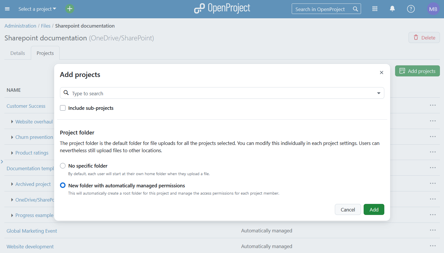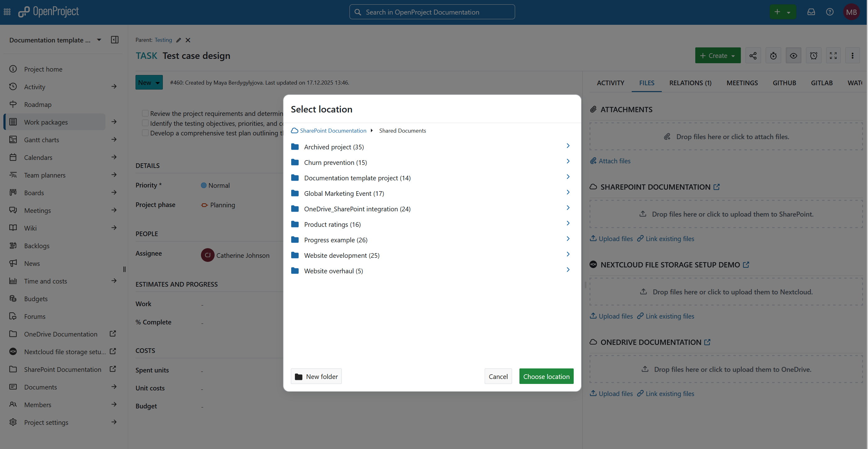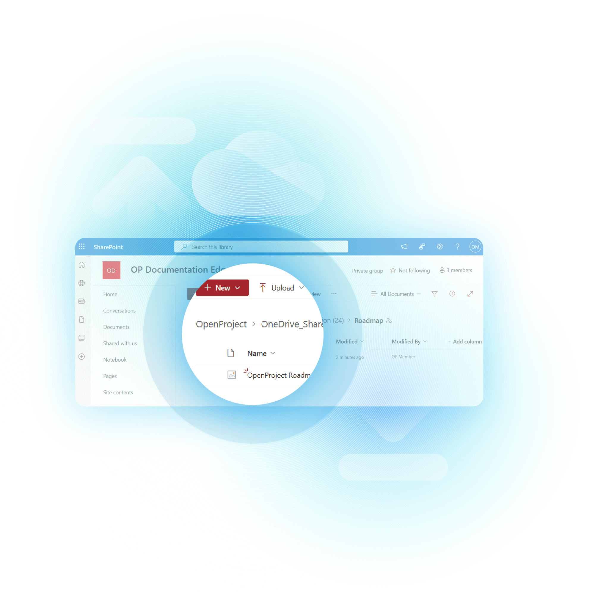 Create and manage OneDrive and SharePoint folders from OpenProject, ensuring seamless organization as your project progresses.