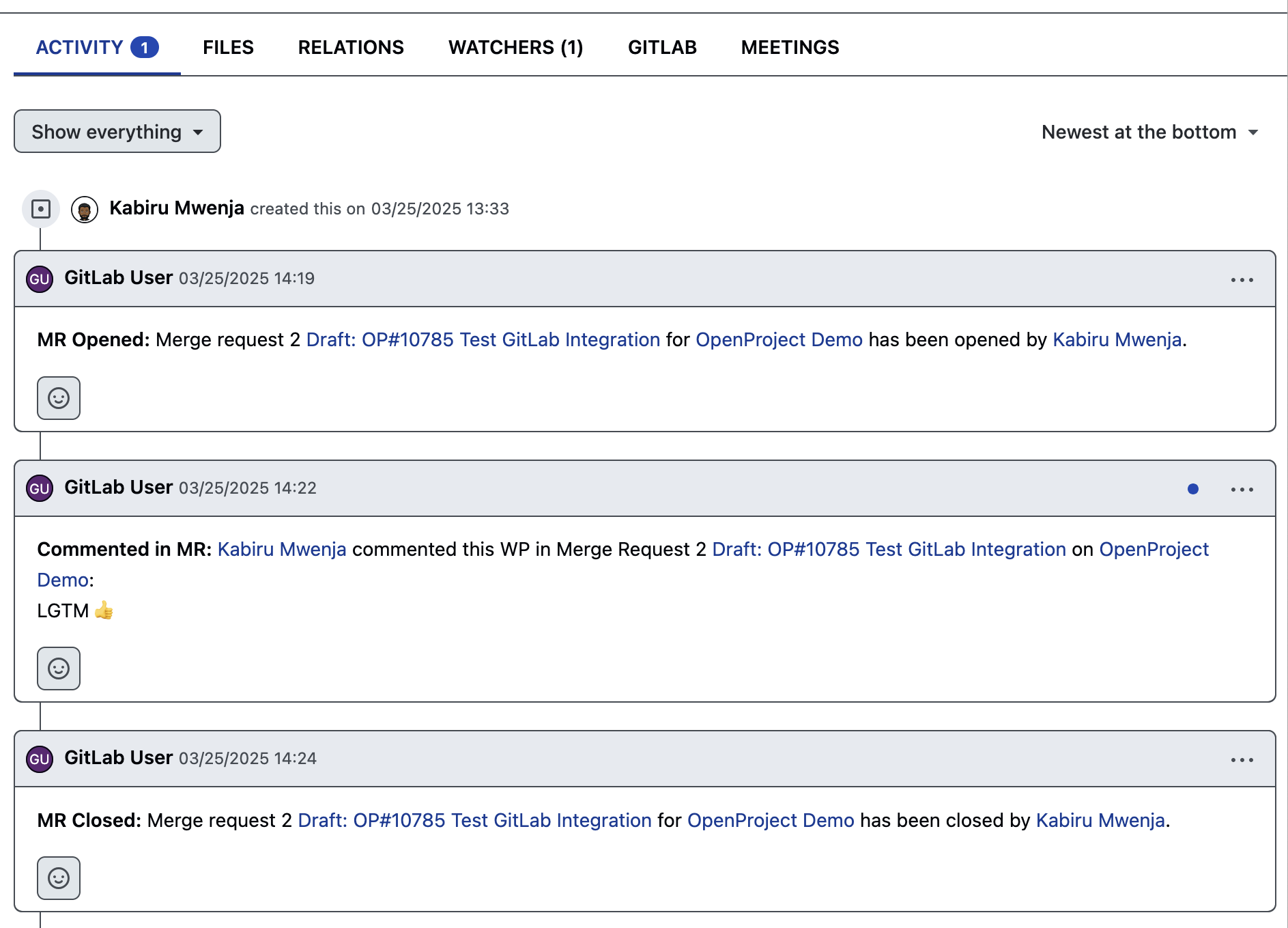 The GitLab integration started as a plugin developed by OpenProject user and developer Benjamin Tey. As more people found it useful, the creator kept adding features, and other developers contributed fixes and improvements. With growing demand from the Community, OpenProject recognized its value and made it an official integration in 2024. This ensured long-term support and further enhancements.