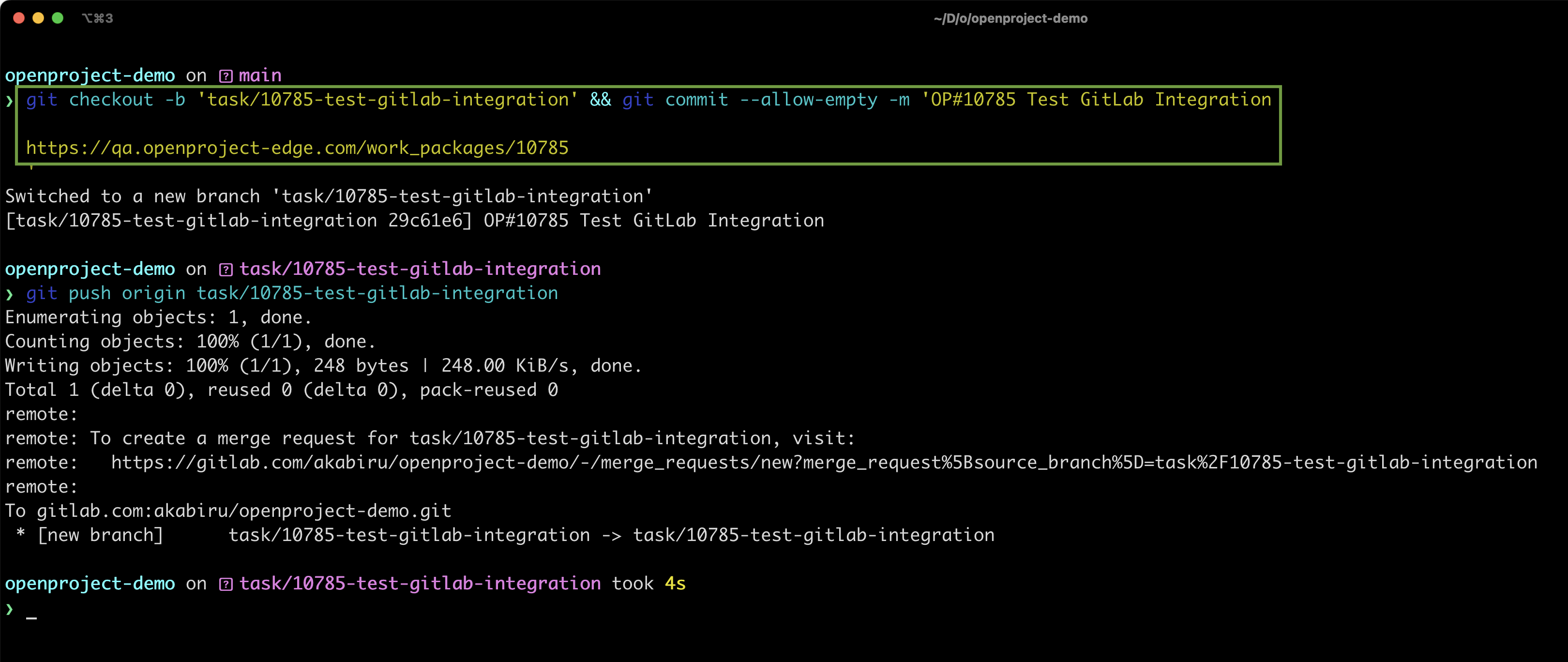 You can create a branch with or without an initial commit and start coding immediately. When you push your changes, the integration adds a note to the Activity tab of the related work package, along with the GitLab tab — no need to leave your CLI.