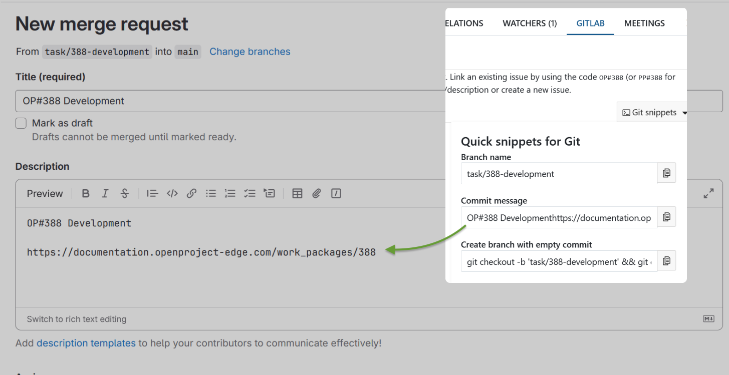 The GitLab integration fits right into your command-line workflow. By referencing work package IDs in your commits or merge requests, you keep OpenProject in sync with your development — directly from your code editor.