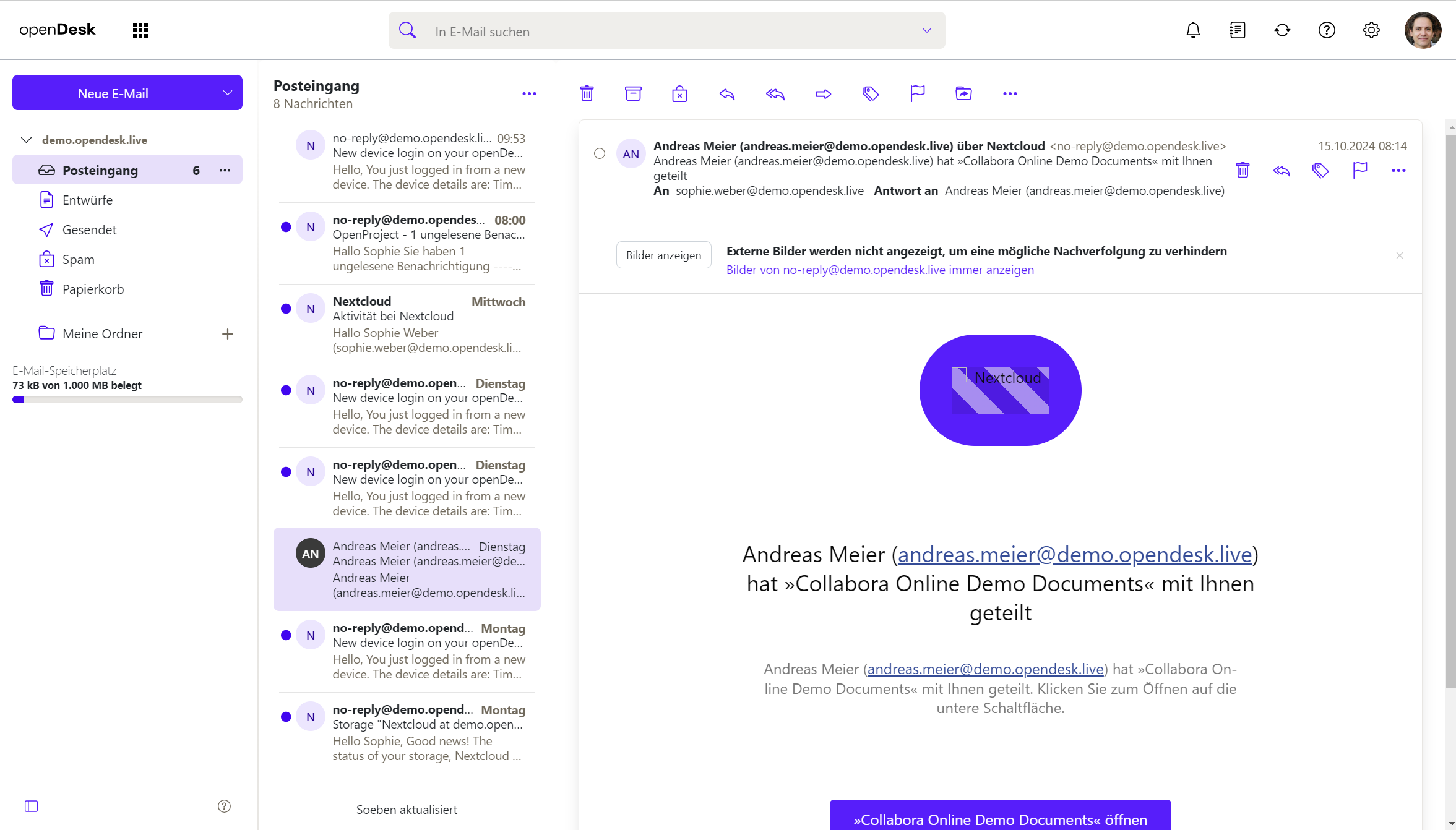 openDesk includes a comprehensive solution to meet your communication needs: You will find features regarding email, calendar and contacts.
