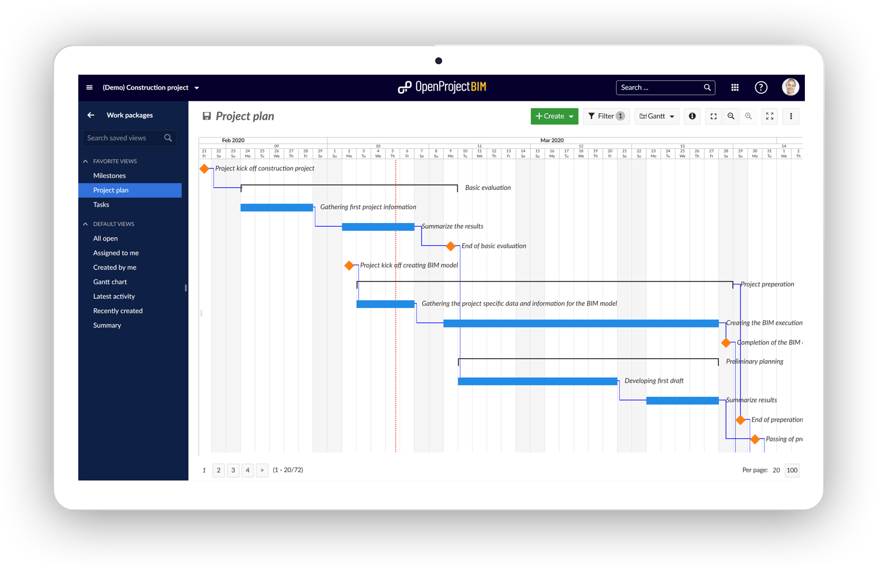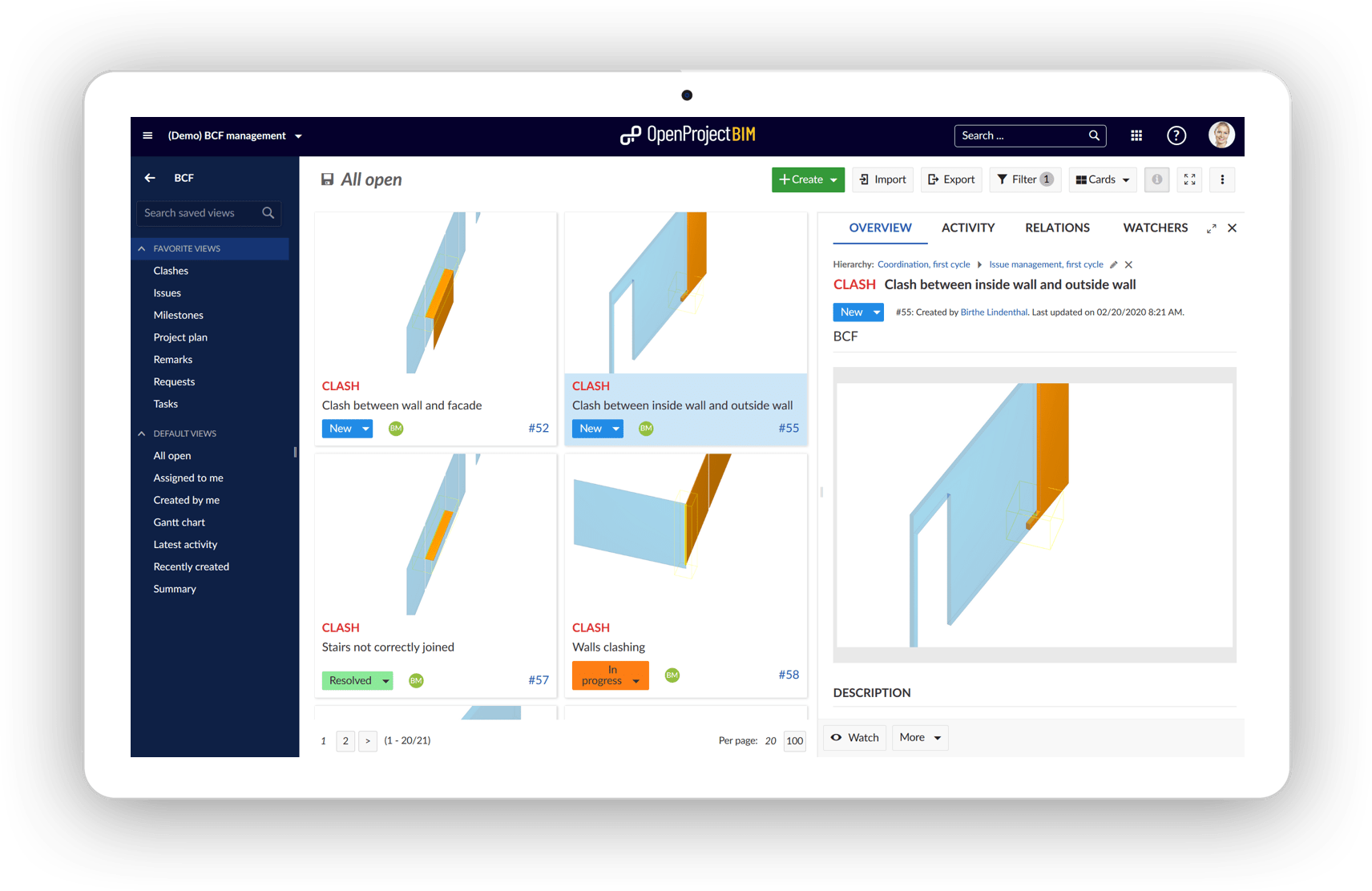 On top of the general project management functionalities, OpenProject BIM enables construction teams to better plan, communicate and collaborate in their building projects. OpenProject BIM includes a 3D model viewer (IFC), support of the BIM collaboration format (BCF) for issue management, and much more powerful features, e.g. a Revit integration, to come soon.