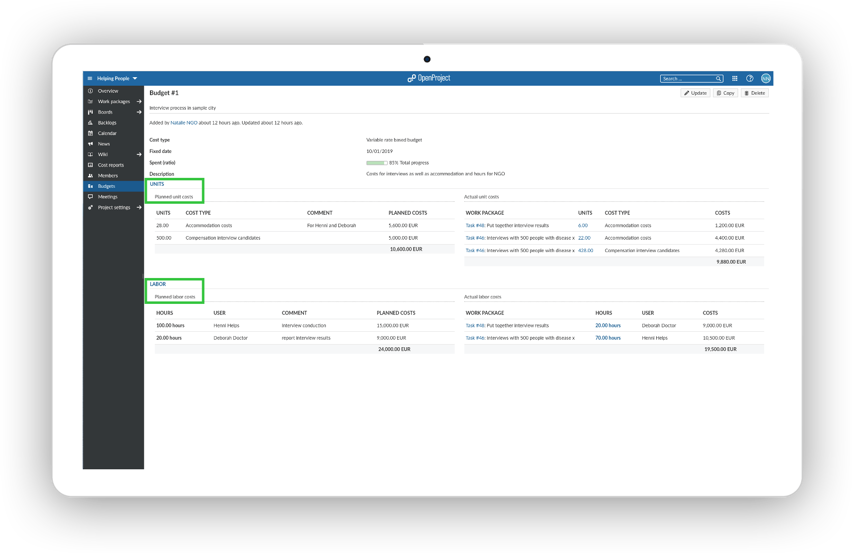 Plan the costs for each project phase and see at a glance how much of the allocated budget - personnel or material costs - has been spent.
