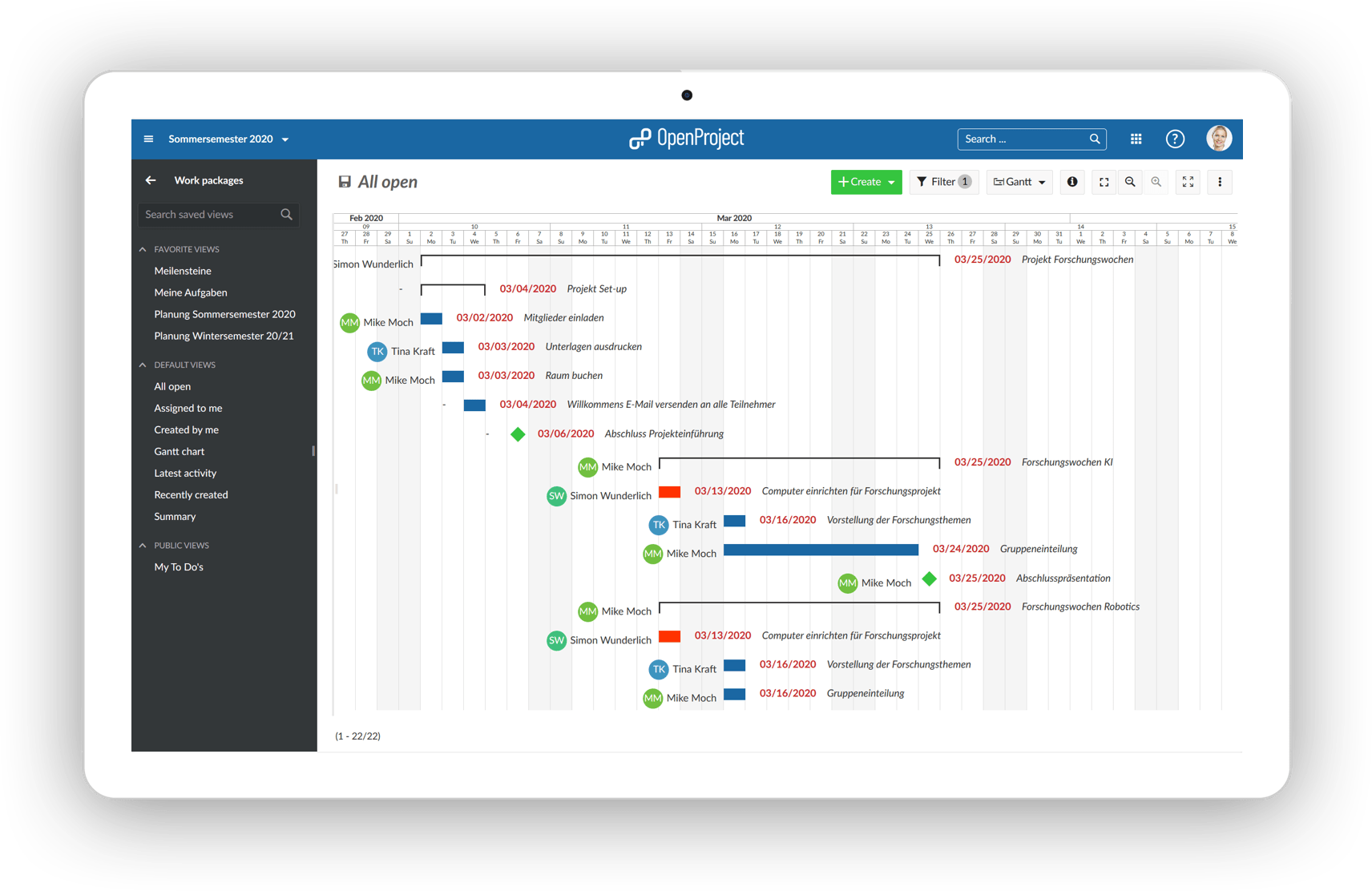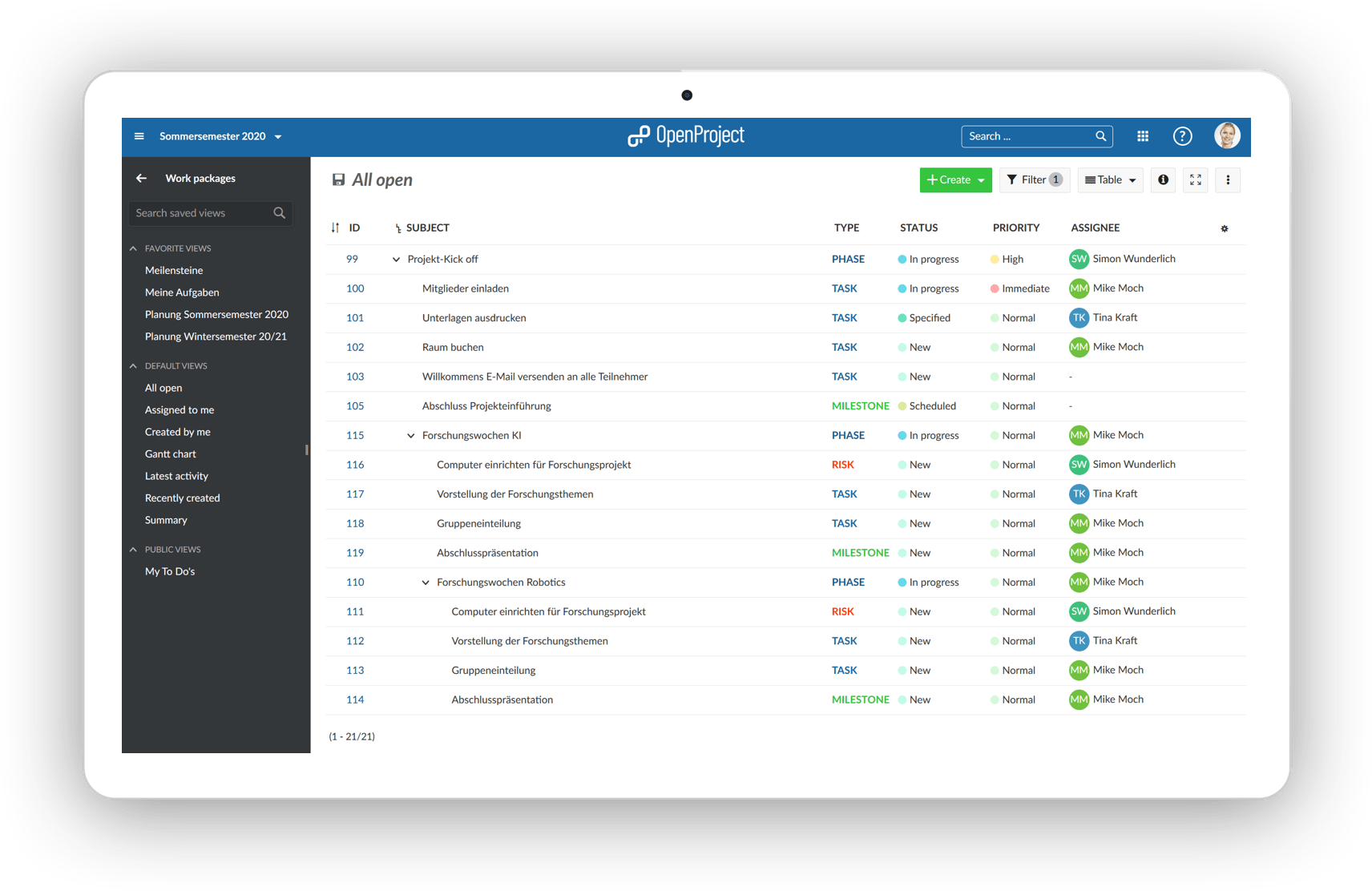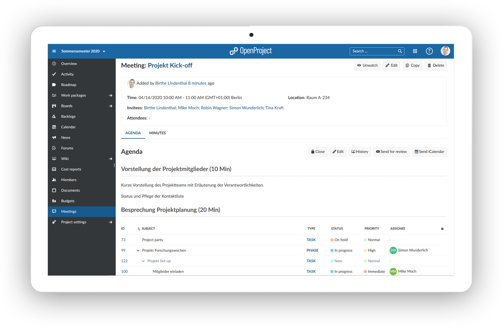 A structured project plan is created for the projects in OpenProject and the work packages are then broken down, distributed and processed.