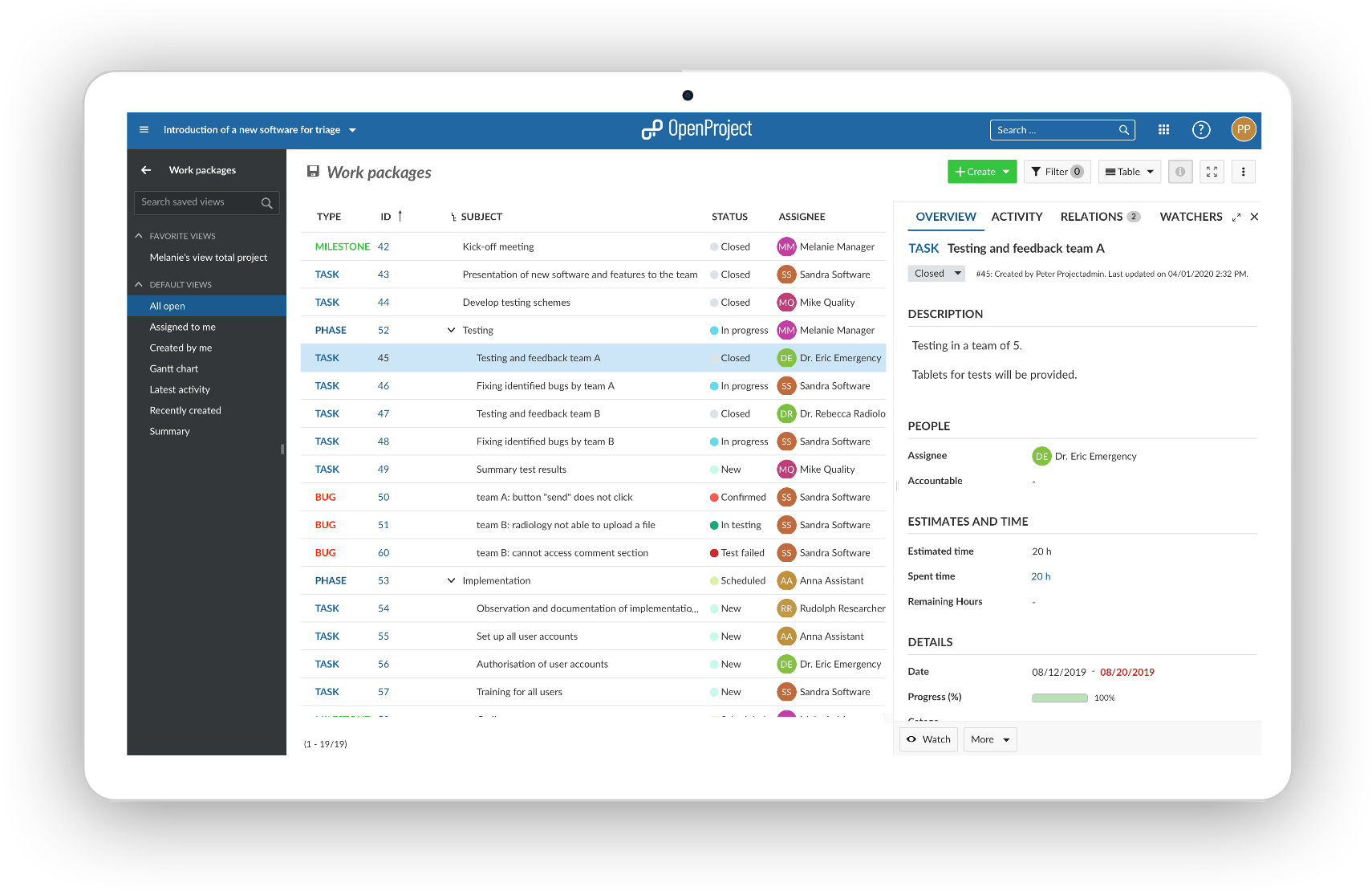 For the projects, work packages are created in OpenProject, project members are assigned, they edit and change the respective status.