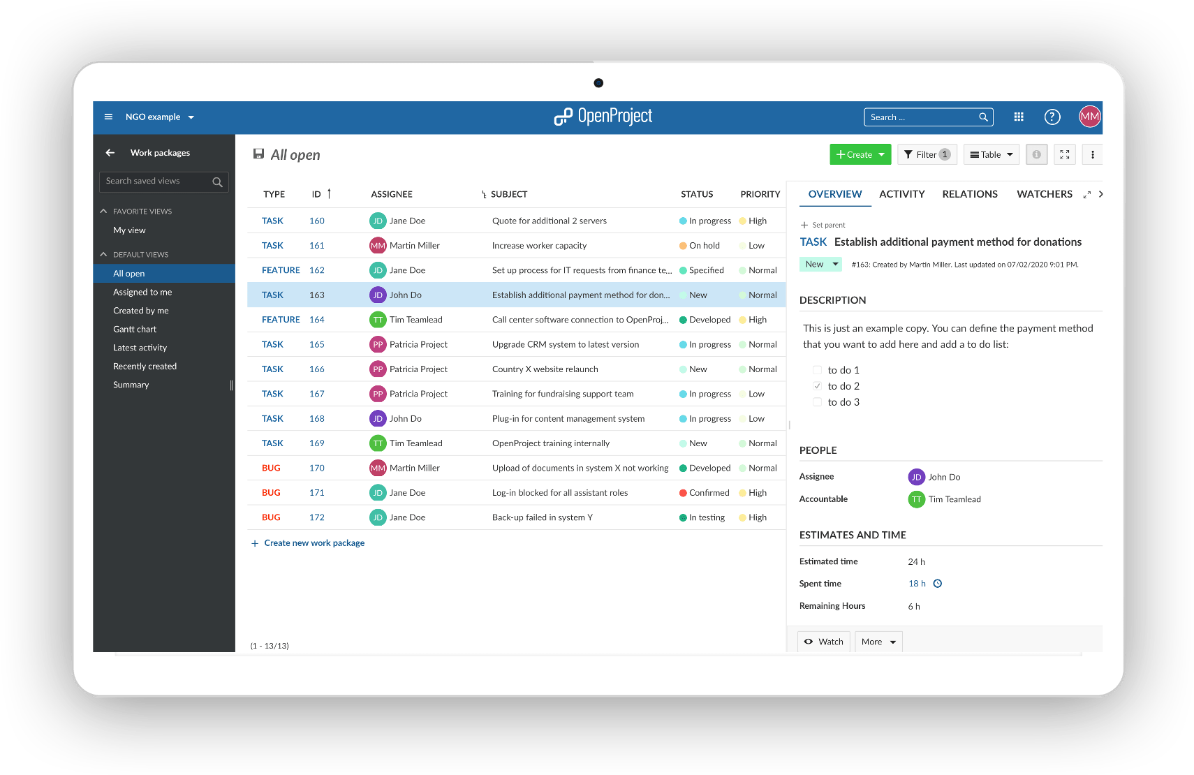 OpenProject for Greenpeace serves as a ticketing tool thanks to a customized plug in. All incoming IT requests can be converted from email into a task, assigned to a person, to a project or even a new project can be created from a ticket.