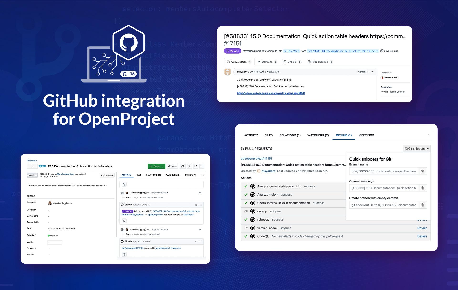 The OpenProject and GitHub integration streamlines development workflows by linking pull requests and project management tasks.